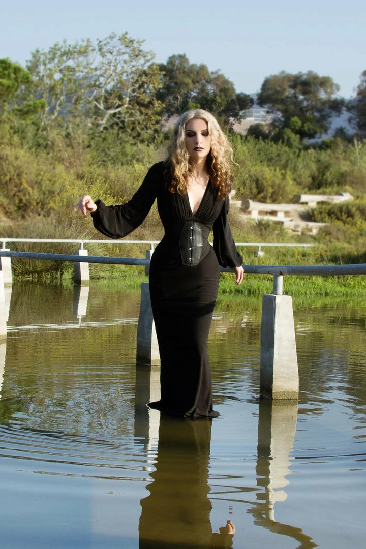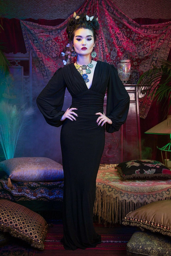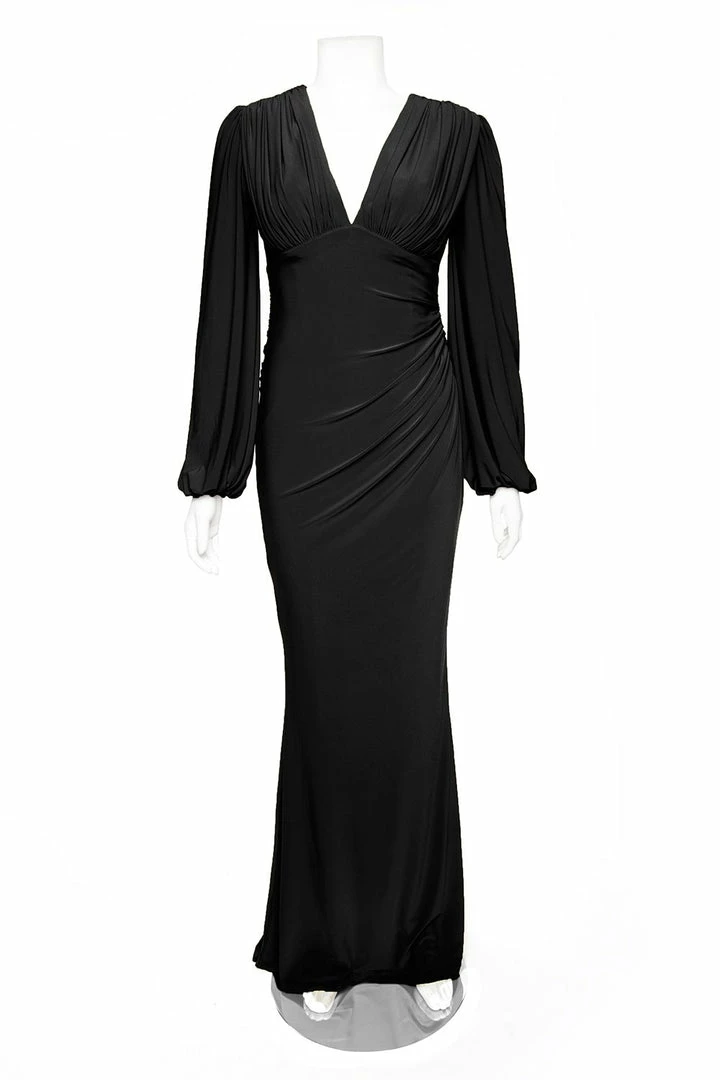 Dare to bare in glamorously decadent style with the Gia Gown. Inspired by the sultry elegance of the 1930s, with a dash of decadence of the 70’s, this stunning design features a deep v cut neckline with two gathered panels over the bust that continue onto the back creating an eye-catching look, while the long sleeves and flowing floor length skirt elongate your figure for a strikingly timeless silhouette. But that’s not all; a built-in stretch bengaline shaper for the bust, waist, and thighs gives support, structure, and holds you in, while the gathered outer fabric disguises the internal structure and offers a seamless look that’s also remarkable comfortable to wear. Finished off with a bridal zipper at the back (if you have trouble zipping it up, just zip it up and down a few times to loosen it up!)