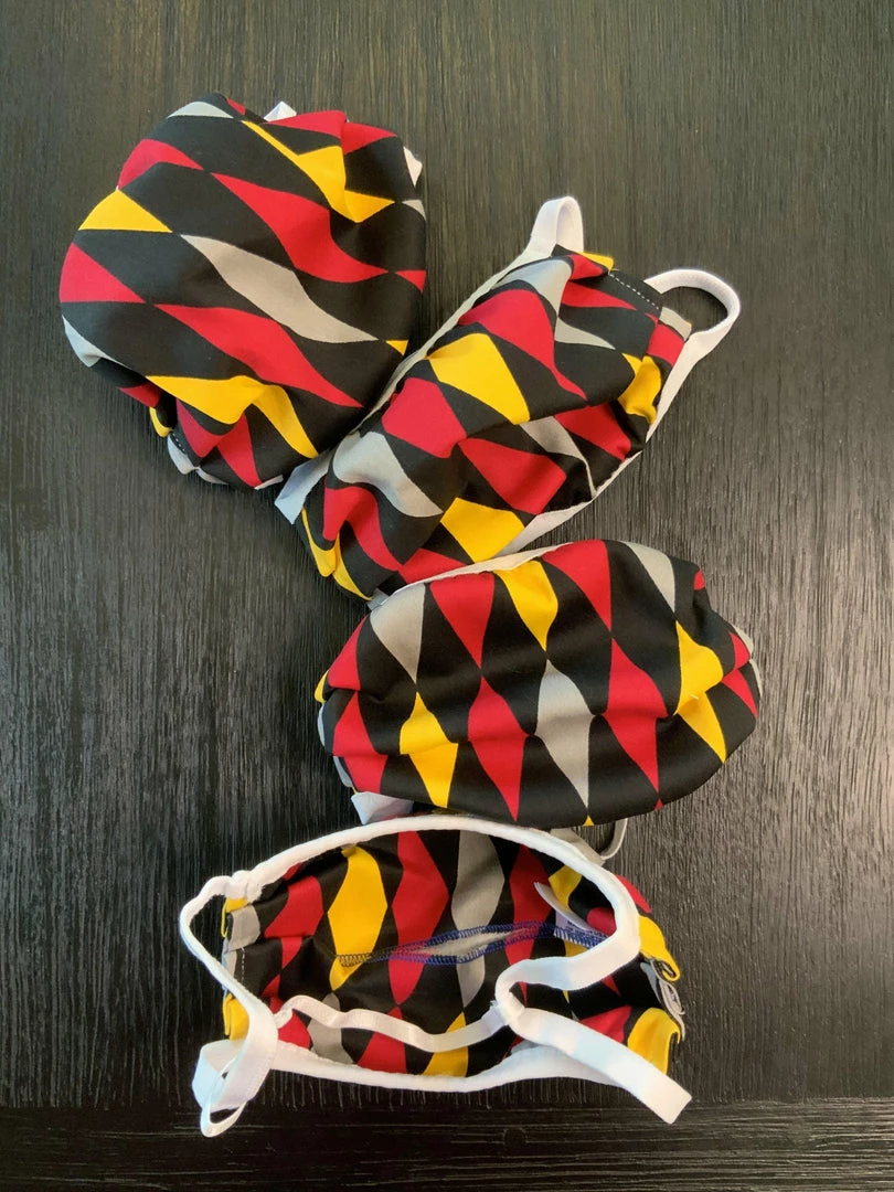 Style #1 – has elastic all around mask. This set of four fabric masks measure 7 1/2″ x 3 1/2″ flat, and when worn will open to 7 1/2″ x 6″ and covers the top of the nose down to underneath the chin. Fabric is 97% cotton, 3% spandex cotton sateen. Mask is made with an inside pocket to hold a filter. Mask can be worn over an n95 mask to extend its use. Change masks after 4 hours of wear. Machine wash cold and dry low before use.