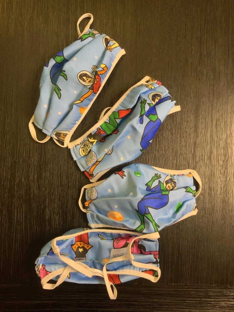 Style #1 – has elastic all around mask. This set of four fabric masks measure 7 1/2″ x 3 1/2″ flat, and when worn will open to 7 1/2″ x 6″ and covers the top of the nose down to underneath the chin. Fabric is 97% cotton, 3% spandex cotton sateen. Mask is made with an inside pocket to hold a filter. Mask can be worn over an n95 mask to extend its use. Change masks after 4 hours of wear. Machine wash cold and dry low before use.