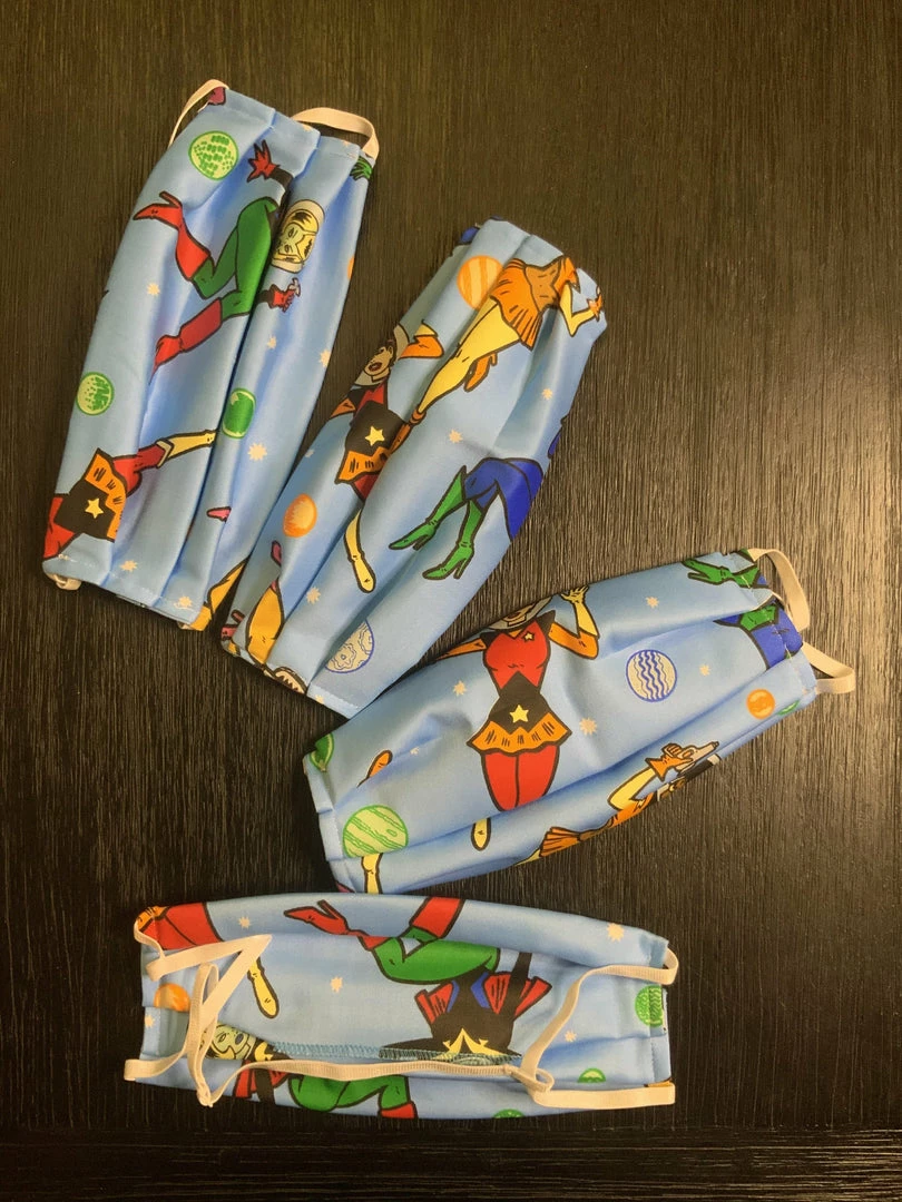 This set of four fabric masks measure 7 1/2″ x 3 1/2″ flat, and when worn will open to 7 1/2″ x 6″ and covers the top of the nose down to underneath the chin. Fabric is 97% cotton, 3% spandex cotton sateen. Mask is made with an inside pocket to hold a filter. Mask can be worn over an n95 mask to extend its use. Change masks after 4 hours of wear. Machine wash cold and dry low before use.