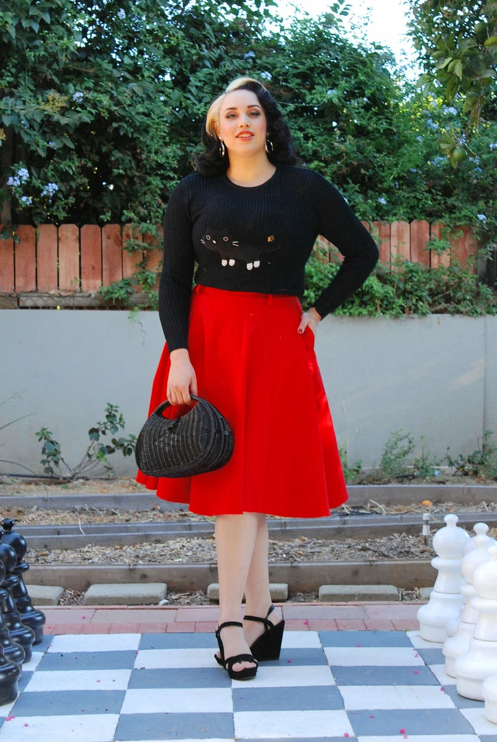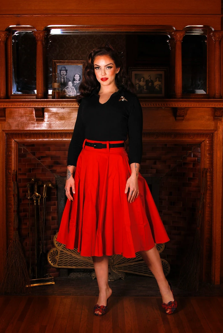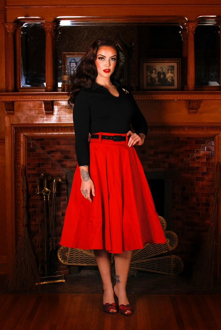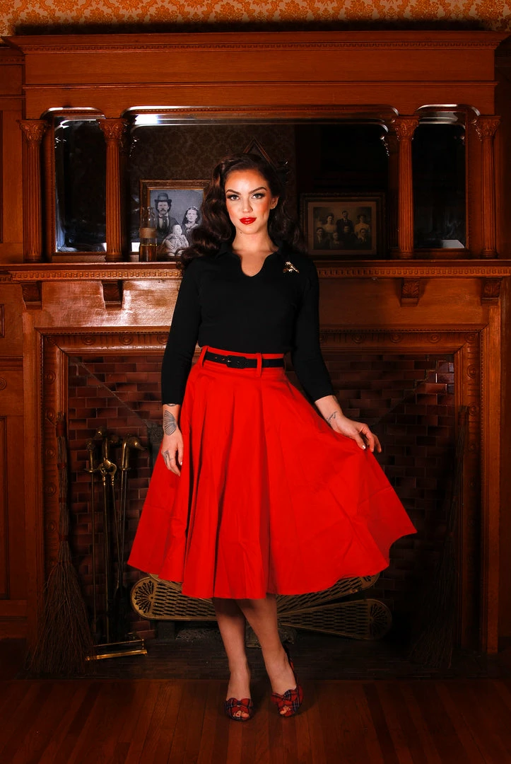 The Doris skirt is a elegant swing skirt with a full sweep and no gathers or pleats. However, it’s the 21st century, so this skirt has deep pockets. Designed as a callback to the true circle skirts of the 1950’s, It has a nipped in waistband, a back zipper, deep pockets, and loops for a wide belt. Made from the highest quality, heavyweight cotton sateen. If you’re looking for that added oomph under, we suggest our Twill Underskirt. Shown with the Myrna Top in Red Gingham, coming soon.