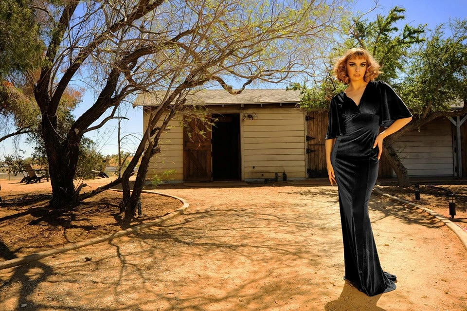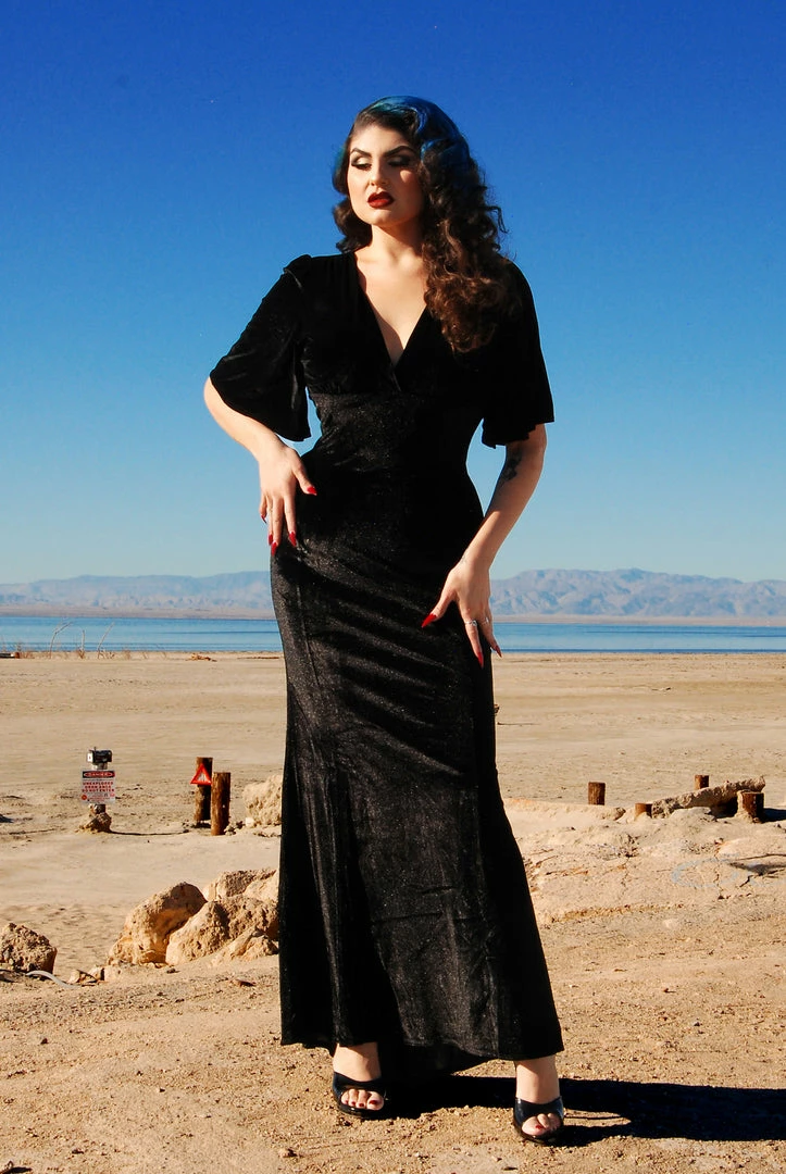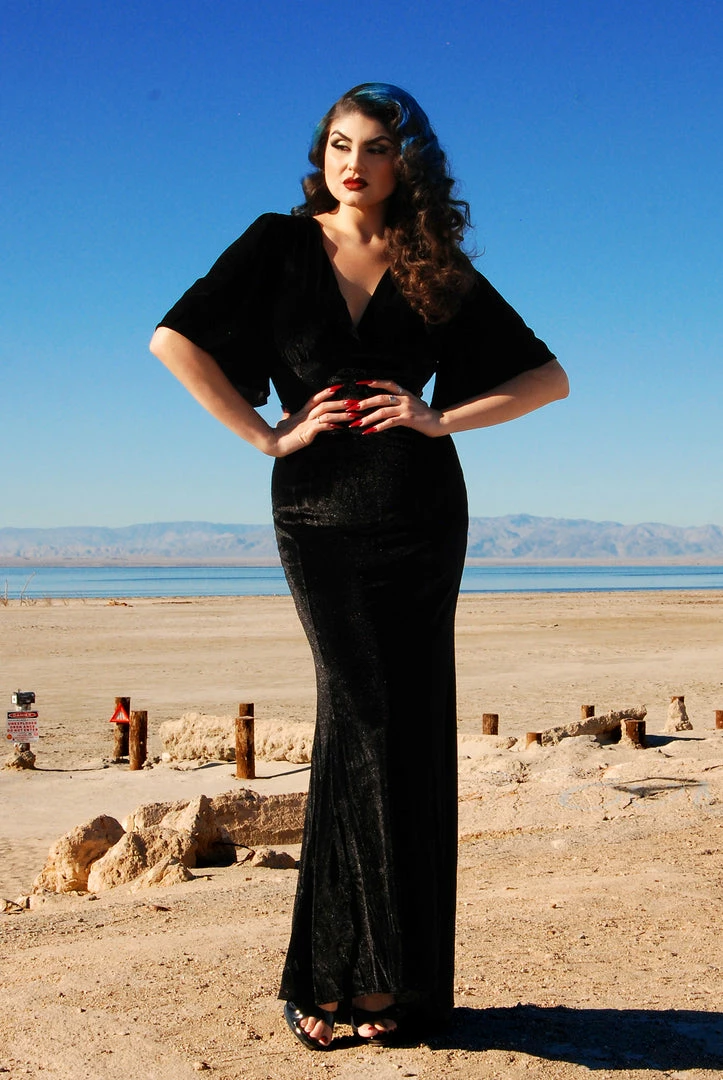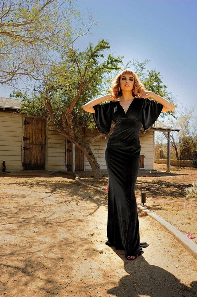 Pinupgirlclothing.com Shop All In-Stock Items By Size Final Sale – Valeria Deco Maxi Gown In Black Stretch Velvet | Laura Byrnes Design
