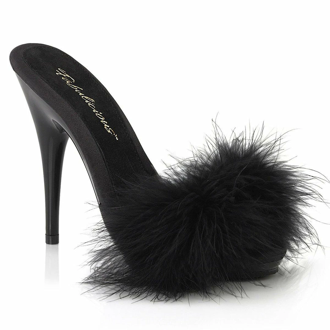 Set out to scandalize in these 5″ heel marabou mules in classic black.