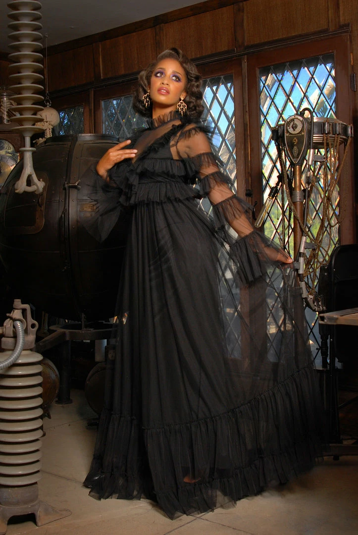 This dark and very sexy maxi features a sheer mesh neckline and ruffle sleeves, with a gathered maxi ruffle skirt that sits at an Edwardian empire waist. Zip back. Designed and sewn in Los Angeles.