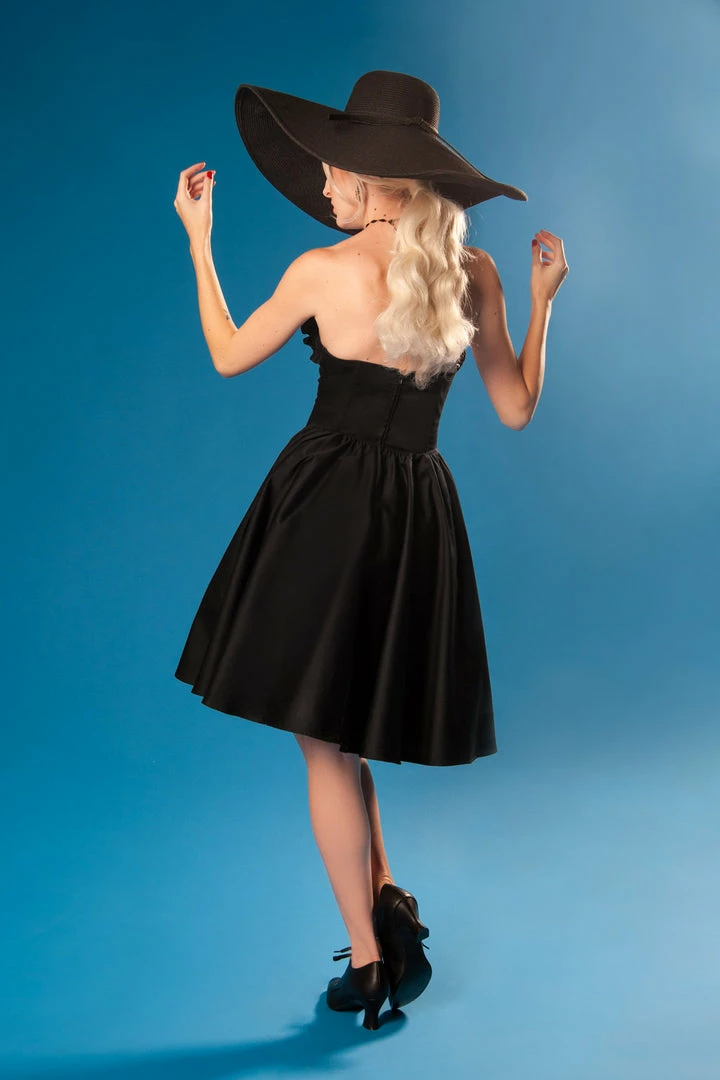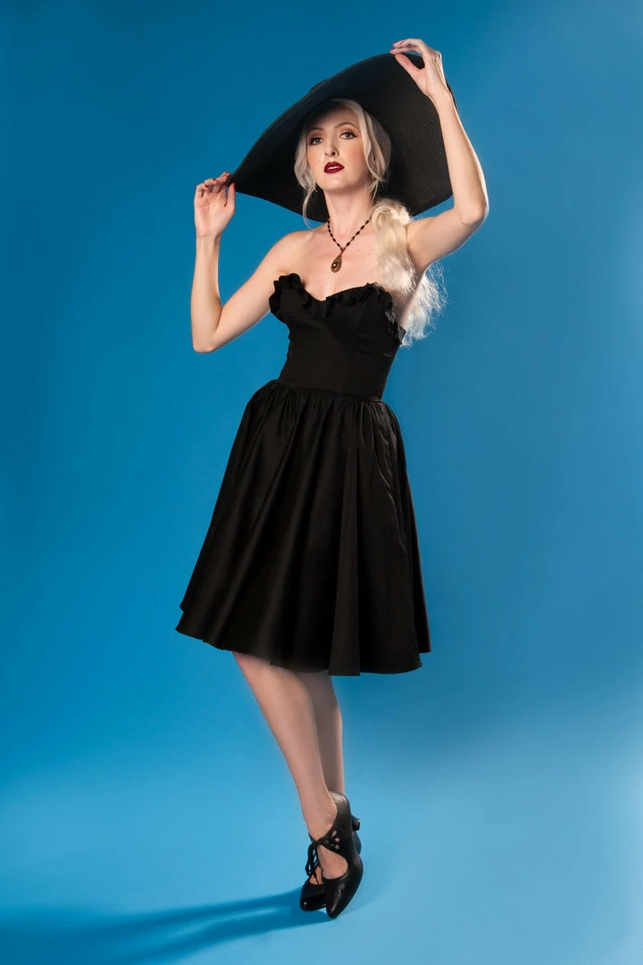 This beautiful creation defies gravity while elevating your spirits, thanks to its impeccably constructed cotton sateen strapless bodice that features plastic boning on the sides and front to enhance your décolletage, and a charmeuse lining to keep everything smooth and comfortable. A flirty ruffle across the bustline adds a unique touch and further enhances this dreamy design’s vintage-inspired silhouette. The Bela Dress is finished off with a zipper that runs the full length of the back and into the flowing skirt that cascades gracefully from the fitted bodice and includes deep pockets.
