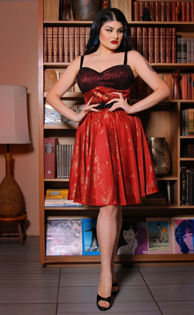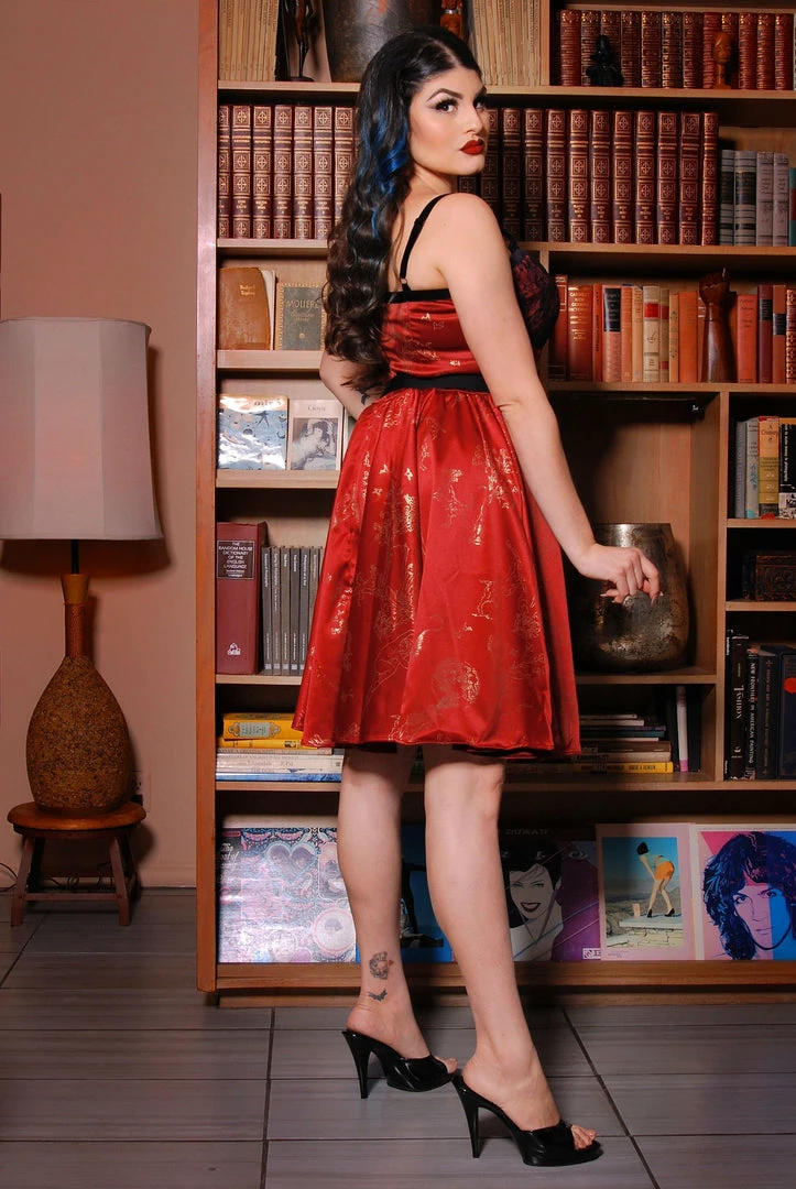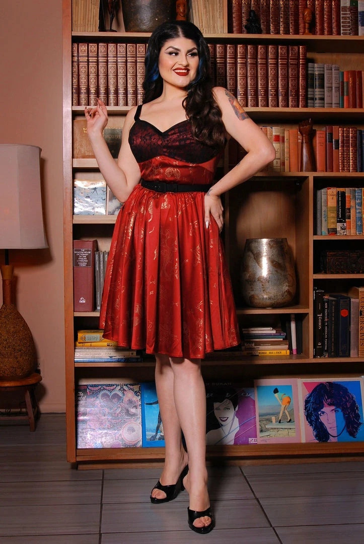 The Courtney dress features a full skirt, deep pockets, and a lingerie inspired, lace covered bodice, with piping and adjustable shoulder straps made from stretch velvet. Made from the highest quality stretch satin.