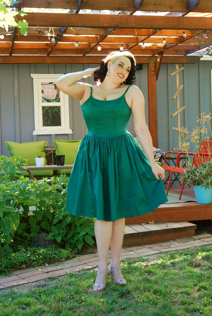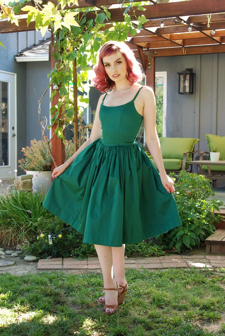 Inspired by an early 1960s sundress design, our classic Jenny Dress is a flirty full skirted, retro dream with a bodice that is boned and fused throughout. This gives your bust amazing structure while beautifully cinching your waist in. The straps are adjustable to accommodate a large range of bust sizes, no matter if you’re smaller or fuller in that area. The Jenny Dress is now considered a Pinup Girl favorite, as it gives you the effortless option of wearing it to work with a cardigan or transitioning to effortless drama for cocktail hour. Made in our beautifully luxe cotton sateen which breathes as you wear it, but will not lose its shape giving you wear for years to come. This dress has a full gathered skirt with deep side pockets and is finished off with a long back zip.Â