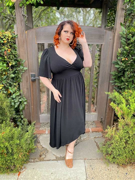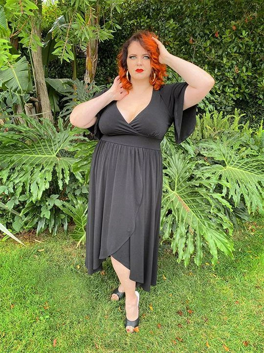 Katy is made from a supremely soft ITY knit fabric, and features a fitted bust and a daring deep v-neckline. The banded waistline is accentuated with a gathered, high-low skirt in the same ITY jersey fabric, which pairs perfectly with the slightly-gathered fluttering bell shaped sleeves. Not to mention the Katy’s subtly sexy front slit – the hint of leg brings this dress from modest to majorly interesting. You’re gonna wanna add this piece into your regular rotation!