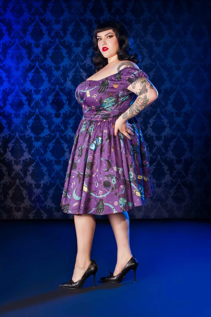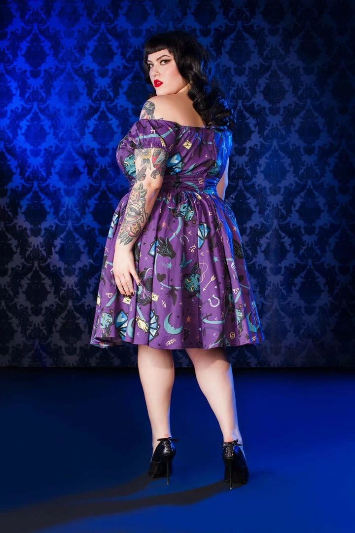 Summon up a magical style in our Fortune Teller Print Peasant Dress. The vintage inspired frock you’ve been dreaming of, she’s made with the same love and care as the popular Peasant Top. This American made dress features an elasticized neckline and arms so it can be worn on or off the shoulders with ease. Constructed of cotton sateen with the bewitching Fortune Teller Print by the transcendentally talented Steph Buscema, and is finished with a back zip and full, flirty swing skirt. You’ll have a magical, 1950s-inspired ensemble, and we predict you’ll bewitch the room wherever you go.