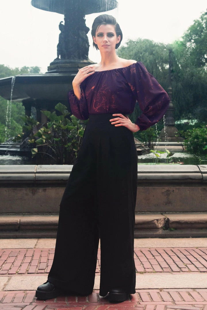 The Sylvie Long Sleeve Peasant Top is unlined in a 3% spandex stretch poly crepe and featuring roomy bishop sleeves, an unfitted, roomy bodice and an elasticized neck.Â