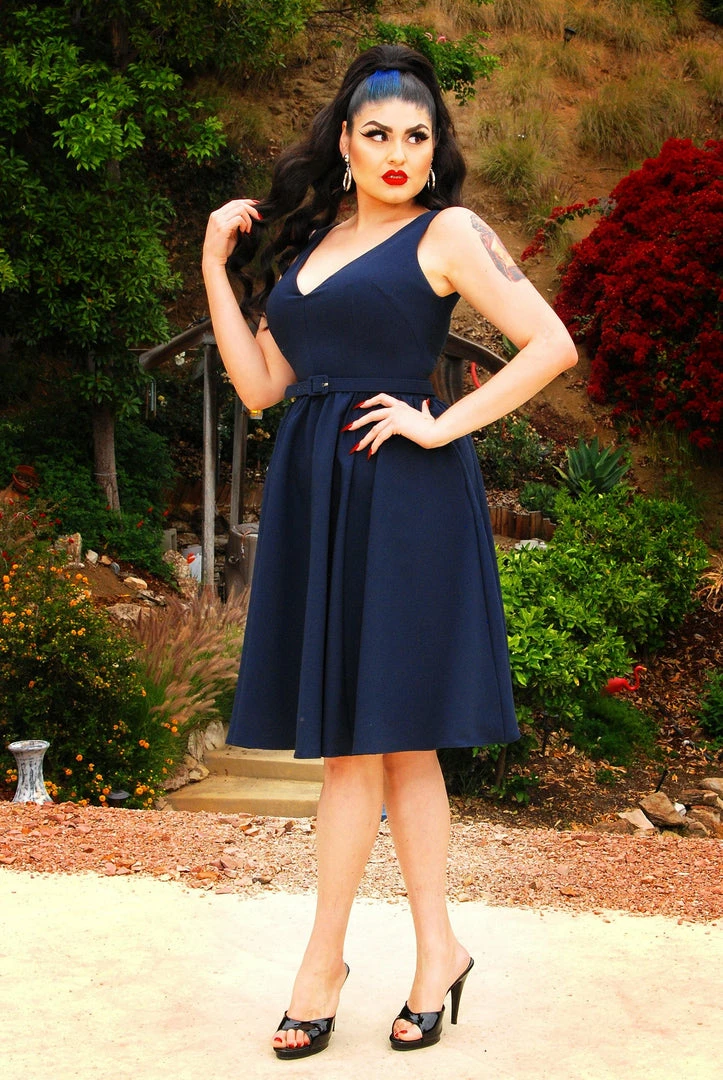 The Tara Dress is made from light and breathable poly crepe, and features a wide v-neck bodice that is modest yet incredibly flattering. The full circle skirt features deep side pockets. Back zip.Â