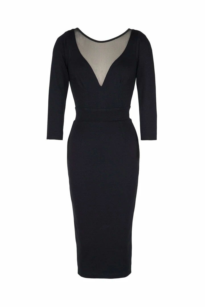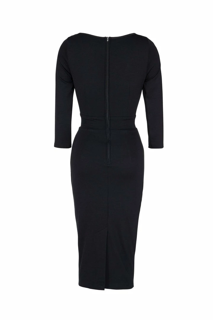 The Theodora Dress features a beautifully fitted top with a sexy, semi-sheer, deeply flattering plunging neckline, allowing this dress to be worn with your favorite cleavage boosting bra. The dress’s construction is enhanced by seaming that cinches your waist and the skirt hugs and enhances your curves perfectly. Made from an alluring black Ponte De Roma and finished off with ¾ sleeves, a hidden zipper and flirty back slit to exaggerate the darkly seductive beauty of this dress.