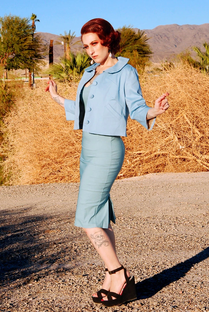 Named with love for Laura’s youngest daughter, the vintage inspired cropped and chic Little Jun Jacket is made with a sturdy, soft stretch twill for long-lasting wear, three-quarter length sleeves, two front pockets, a loose-fitting flared 60’s silhouette, and a rounded collar. Finished off with a row of fabric-covered buttons up the front, this lovely jacket is fully lined in satin charmeuse.
