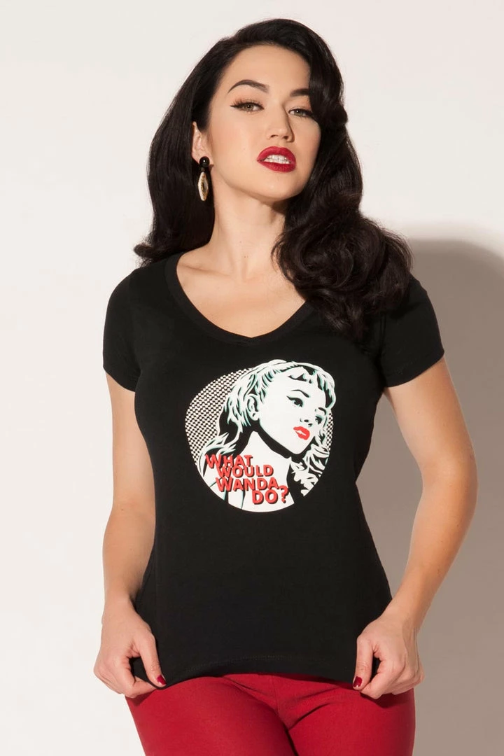 Got a problem? Ask yourself ‘What would Wanda do?’ then put on this bad ass T-shirt, some cherry red lipstick and kick some butt! Folks will know you mean business in this Traci Lord’s approved t-shirt from Couture for Every Body. Featuring an iconic portrait of Wanda–by Wanda herself, Traci Lords and artist TapedoffTV– in a perfect shade of juvenile delinquent black, you can wear this tee tucked into your favorite pencil skirt, high waisted pants or over your brand new Love Your Body Capri Jeans.