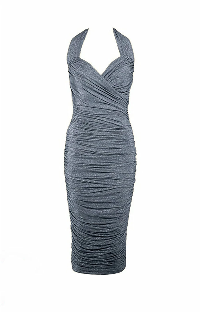 This sexy, midcentury inspired wiggle dress was inspired by the eternally sexy Traci Lords. A stretchy dream girl of a dress, the beautiful crossover bustline provides extra room for the ladies and combined with the adjustable halter ties, provides enough foundation to give you the kind of power cleavage you’ve come to expect from Laura’s designs. Traci also has built in Bengaline shape wear below the bust to the mid thigh that gives support and structure while holding you in. The gathered fabric camouflages the internal structure and gives you a sleek and clean silhouette. The result is an incredibly sexy vintage inspired wiggle dress. The Traci Dress will have you looking like a seductive goddess and feeling like a movie star.