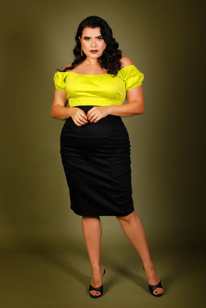 Our Pinup Couture Peasant Top is the perfect little separate you never realized you needed until you were wearing it multiple times a week and collecting every color. Wearable up on the shoulders or shrugged off, there’s ample room for any size bust, and a zipper that goes from the underbust to an inch above the hem for easy over-the-head access. It’s long enough to tuck in, but not so long that you can’t wear it untucked with a pair of Laura Byrnes California Denim Capris. Made out of ultra-comfortable sateen, the fabric will form to your body, and the curved underbust seam on the gathered bust will keep you held in and up.