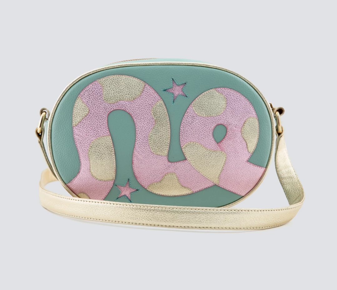 You’ve never met a bag so poisonously cute. Hand crafted in Peru from mint leather, with a metallic pink and gold snake, and gold strap.