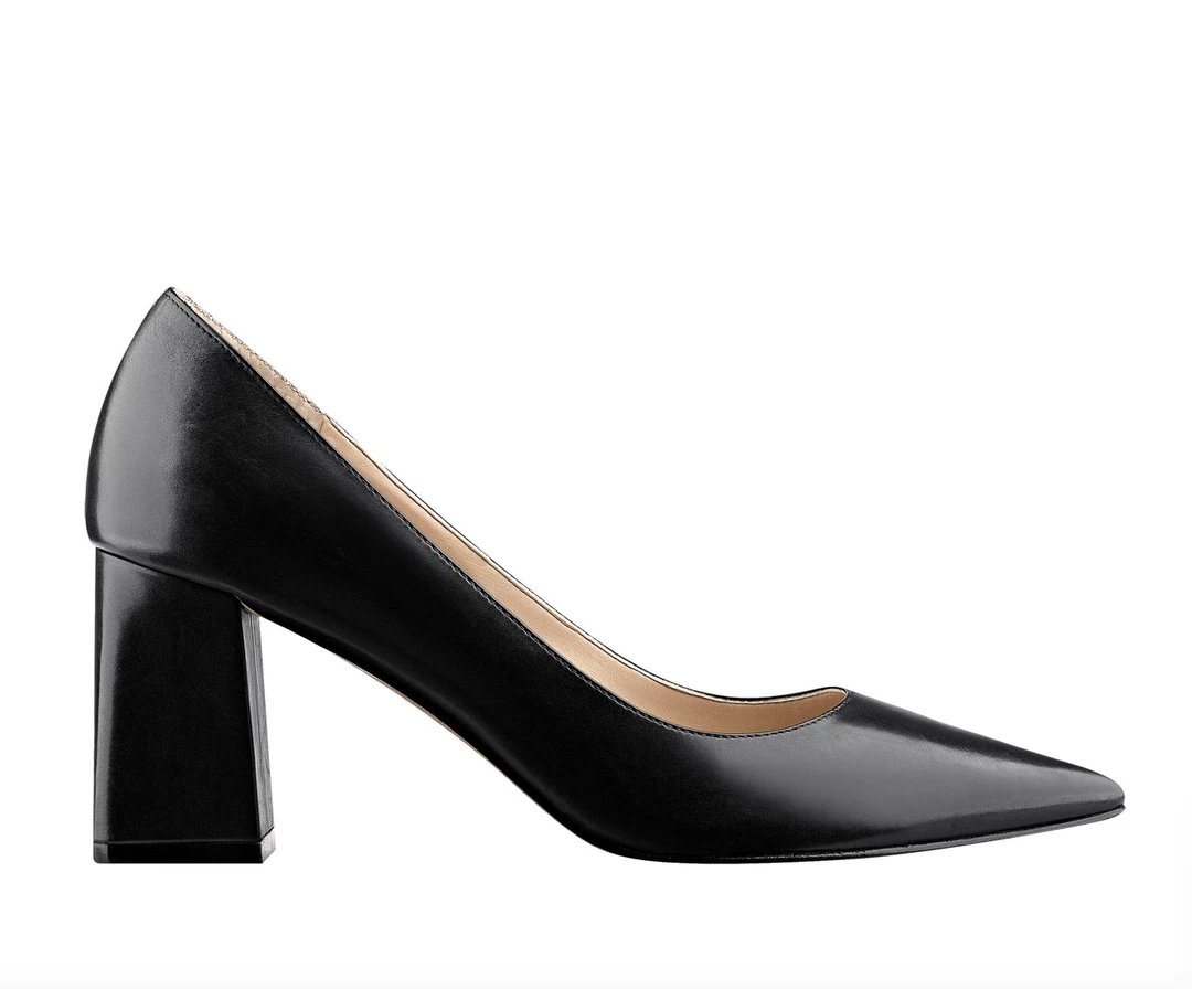 Classic pointy-toe flared heel dress pump with leather sole. This item is built with a leather upper and synthetic lining and leather outsole.