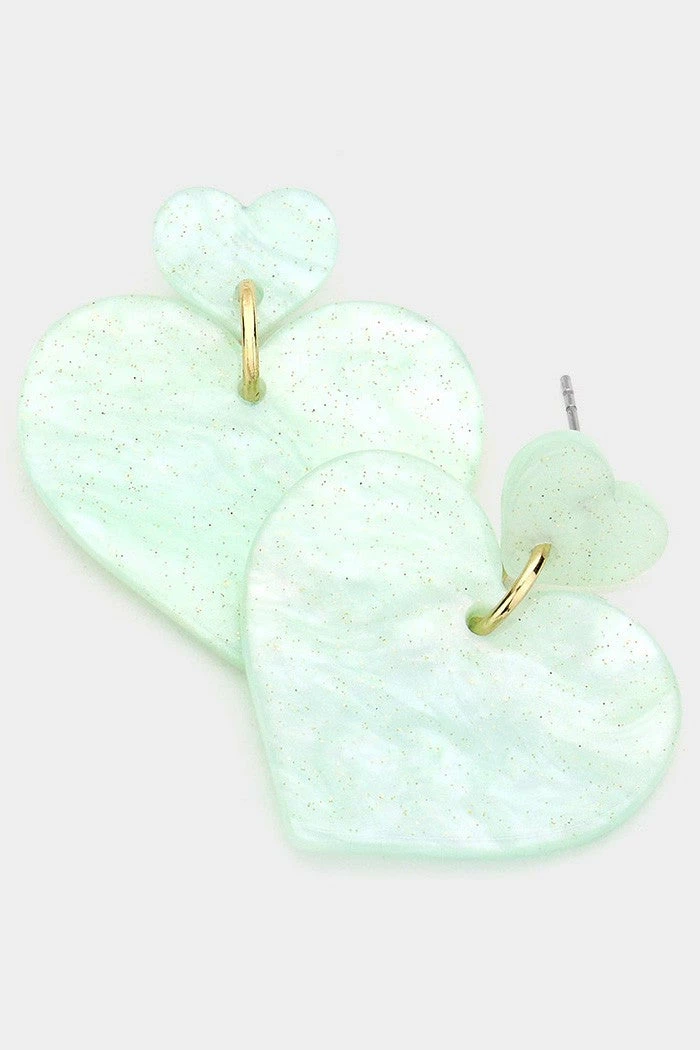 Shimmering minty fresh resin heart earrings with gold detail.Â
