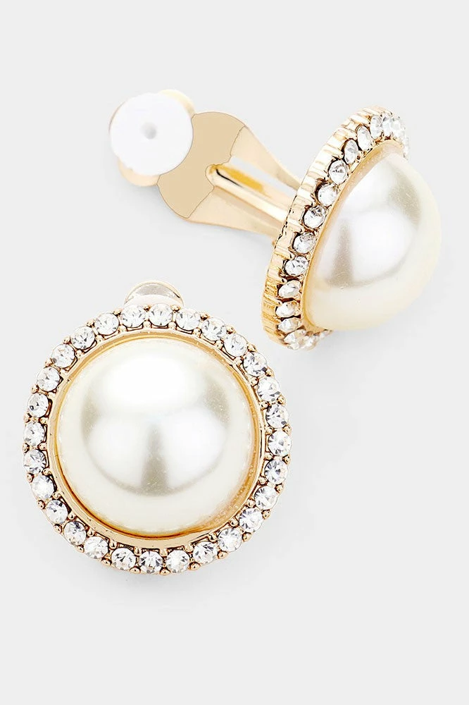 Pearl nestled in a halo of pave crystal, these easy to wear clip on earrings that don’t ask you to sacrifice any the glamour.