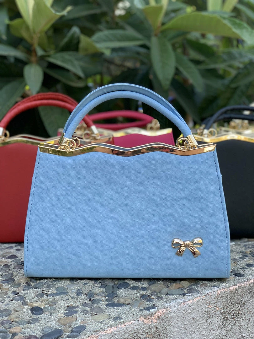 Be prepared to fall head over heels for this effortlessly stylish bag. Made of faux leather, it features a wide scallop edge top hem with faux gold trim, matching faux gold hardware throughout, and topped with a darling little bow at the front panel corner.